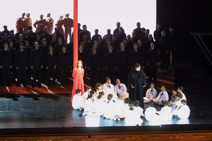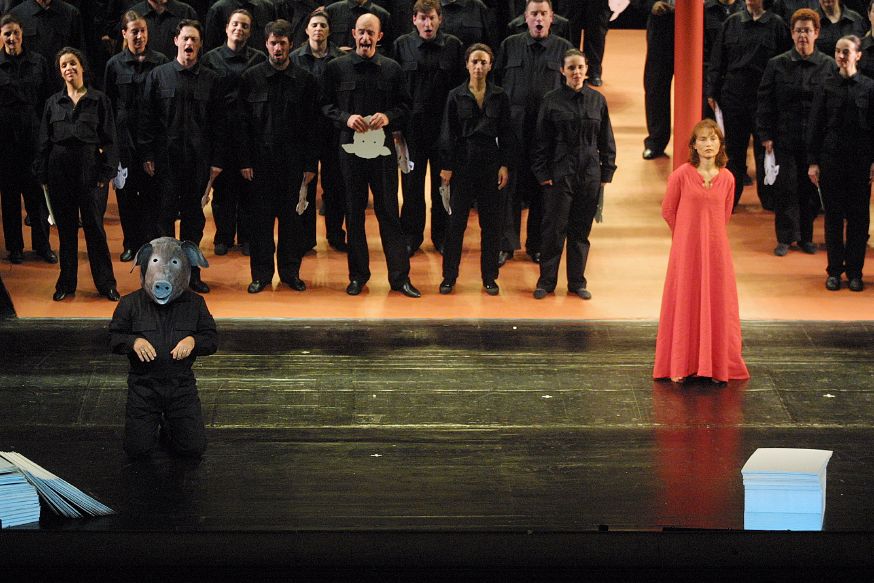 Jeanne d'Arc au bûcher talvez não seja afinal um "mistério". Estamos num teatro, já não estamos numa igreja. De tudo isto se faz, afinal, sobretudo espectáculo. E é desta permanente tensão entre contrários, entre o sublime e o grotesco, o humano e o divino, o alto e o baixo, o mau e o bom gosto, o sagrado e o profano, desta volúpia, desta violência, que o espectáculo se alimenta. Jeanne d'Are au bûcher é então um falso espectáculo religioso? Uma impostura? Em meu entender, é.
