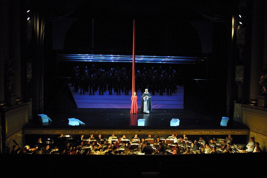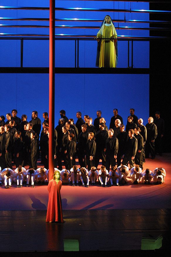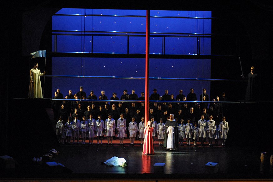 Foi pensando nisto que demos forma a esta "oratória". Guardámos a memória das catedrais na disposição frontal de uma fachada, na sugestão, entre poste e ponte metálica para a Virgem, da forma da cruz. As santas em nichos. Mas tudo deixando aparecer a caldeirada de elementos expressivos a que a obra recorre. O coro, negro como de costume mas dessolenizado por modernos fatos de trabalho, ora estático ora profanado com grosseiras figurações da ópera mais convencional ou jogos de music-hall. As crianças como em coro de escola. Deixámos que se "sujasse" a tradicional forma cénica de um concerto coral com a irrupção de figuras de vários teatros para as pantomimas que o percorrem. Permitimos o simbolismo das cores. Branco-luz e preto-treva para as vozes, e vermelho de fogo para a chama dessa vela em que Joana se transforma na fogueira de Rouen, para o simples fato escarlate com que a figuraram na célebre iluminura. As cores do baralho para as cartas. Azul e estrelas para o céu. Algum esquematismo para esta arquitectura. Nenhuma elegância. Óbvios efeitos de teatro para a leitura desse livro que, sem saber ler nem escrever, diz Claudel que Santa Joana d' Arc escreveu com a sua vida e os anjos talvez traduziram para sempre no céu.