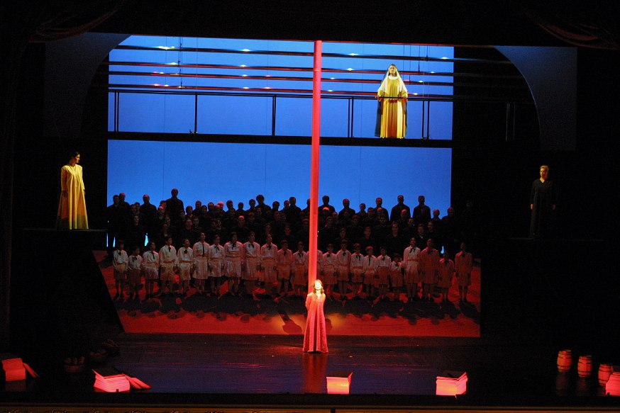 Tudo "suja" o carácter religioso da obra, tudo o humilha, tudo o profaniza, tudo o humaniza. No lugar central de Cristo está uma mulher (e originalmente, para essa virgem pastora e guerreira, que mulher!: Ida Rubinstein), no lugar da cruz o poste, no lugar do clero os animais, no lugar do pão e do vinho da consagração "Ie bon pain ed France, le bon vin ed France", no lugar do presépio um desfile militar, e por aí adiante. A música colabora com a frequente passagem (em profunda unidade) do tom mais elevado para o mais vulgar. Ao mais sublime se dá forma através do que nos soa a pastiche ou cliché. Há um desagradável nacionalismo francês que também profaniza o tema. E há acima de tudo o próprio palco na vez do altar. E o próprio gigantismo dos meios (protagonista, coro de adultos, coro de crianças, cantores, actores, orquestra sinfónica) que tanto parece engrandecer o assunto como, no seu luxo, ferir grosseiramente a austera pureza daquilo que afinal se representa: uma subida ao céu. A própria operação é impura. Esta ostentada teatralidade rouba a Deus o que é de Deus. Expulsai os vendilhões do templo!